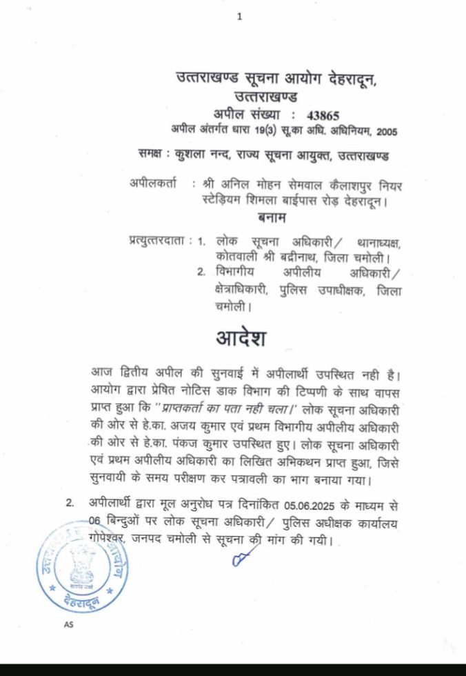 प्रथम अपीलीय अधिकारी के स्तर से भी संतोषजनक जवाब नहीं मिलने पर सेमवाल ने राज्य सूचना आयोग में अपील की थी, जिस पर सूचना आयुक्त कुशला नंद ने यह आदेश दिया है।